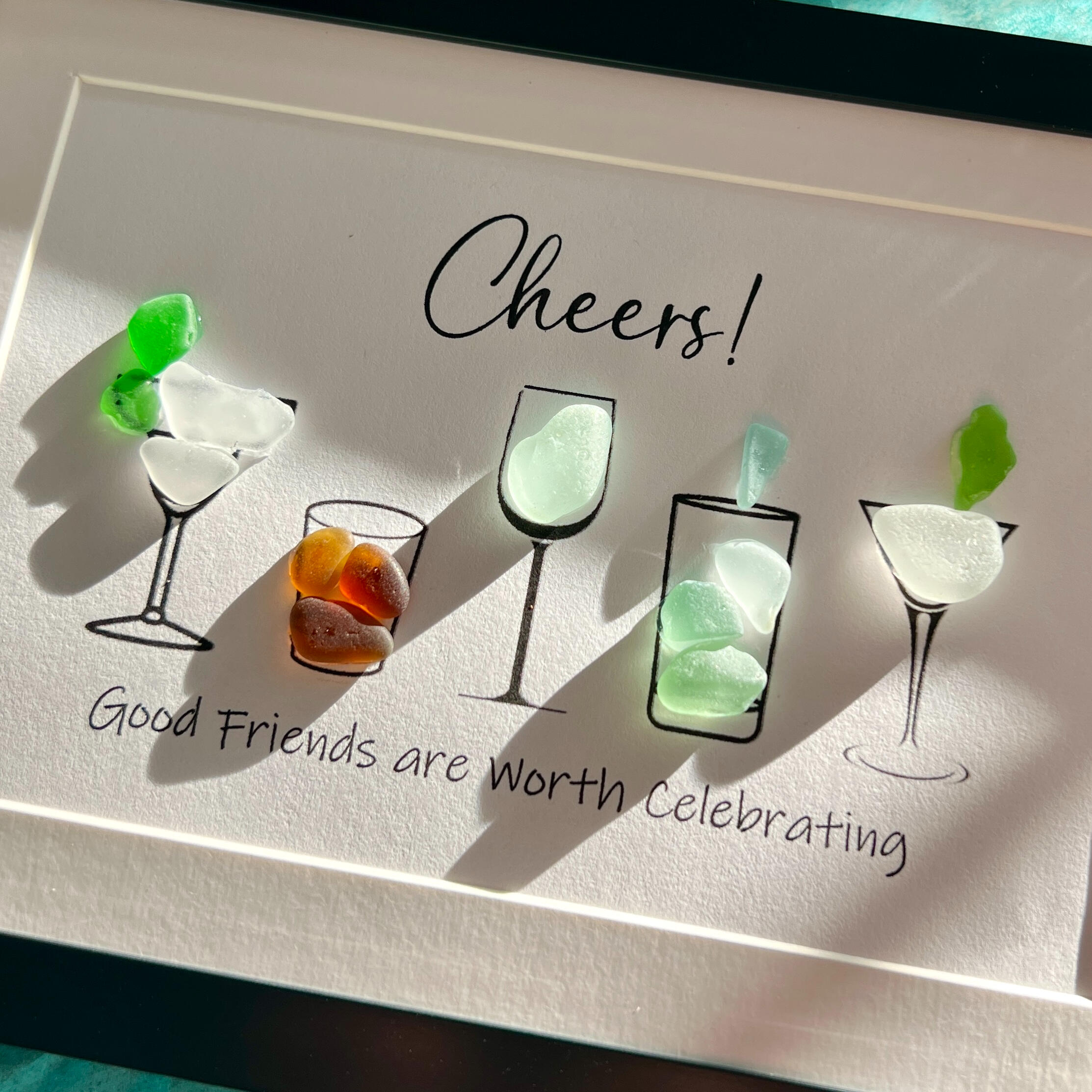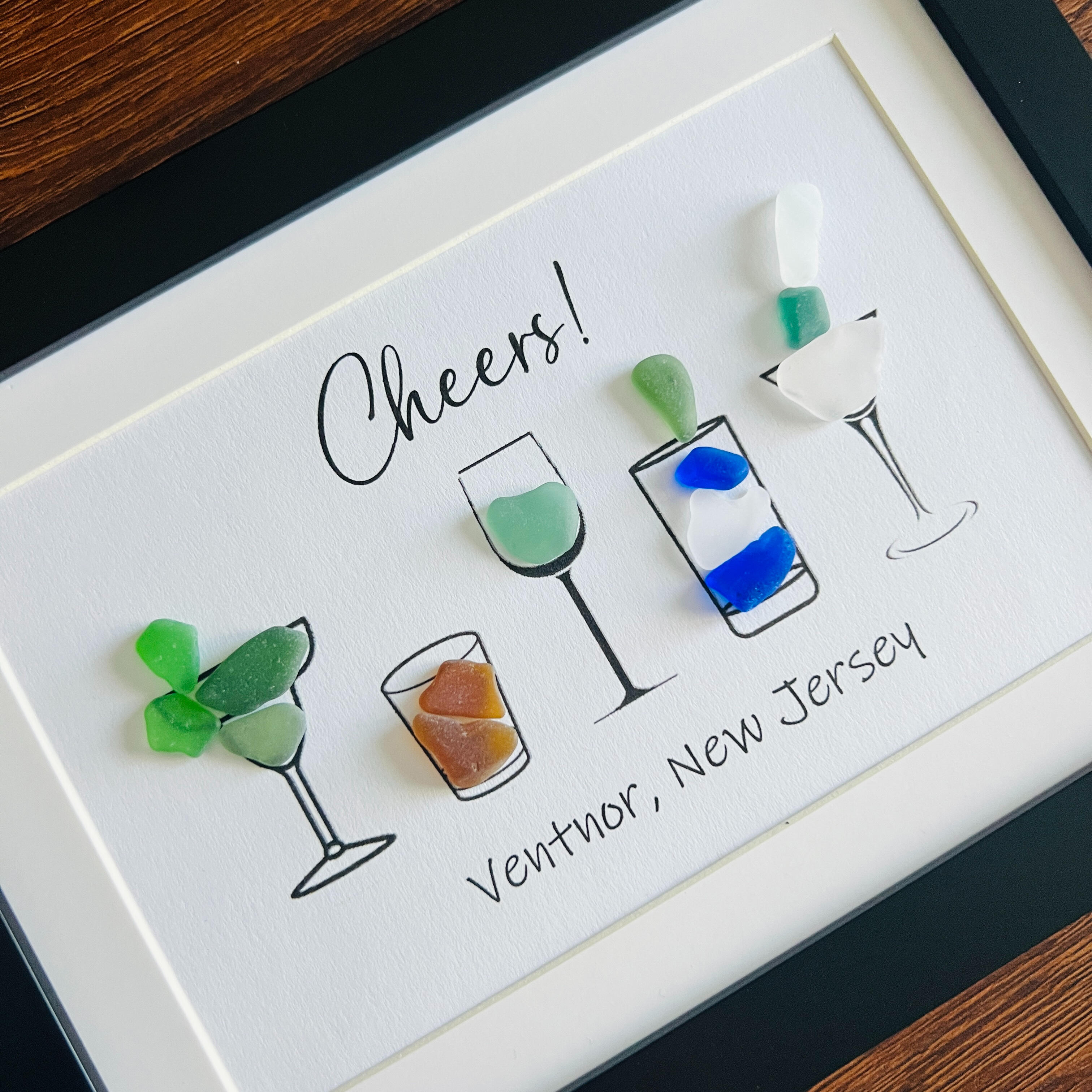 I created this Cheers! sea glass picture on St. Croix, VI where I lived & worked as an artist for a few years. It was a very popular souvenir for tourists and a great gift item for locals. Now, on Etsy, you can personalize this with 1-2 lines of text. Get creative! Custom ideas are welcome too. Take a look...